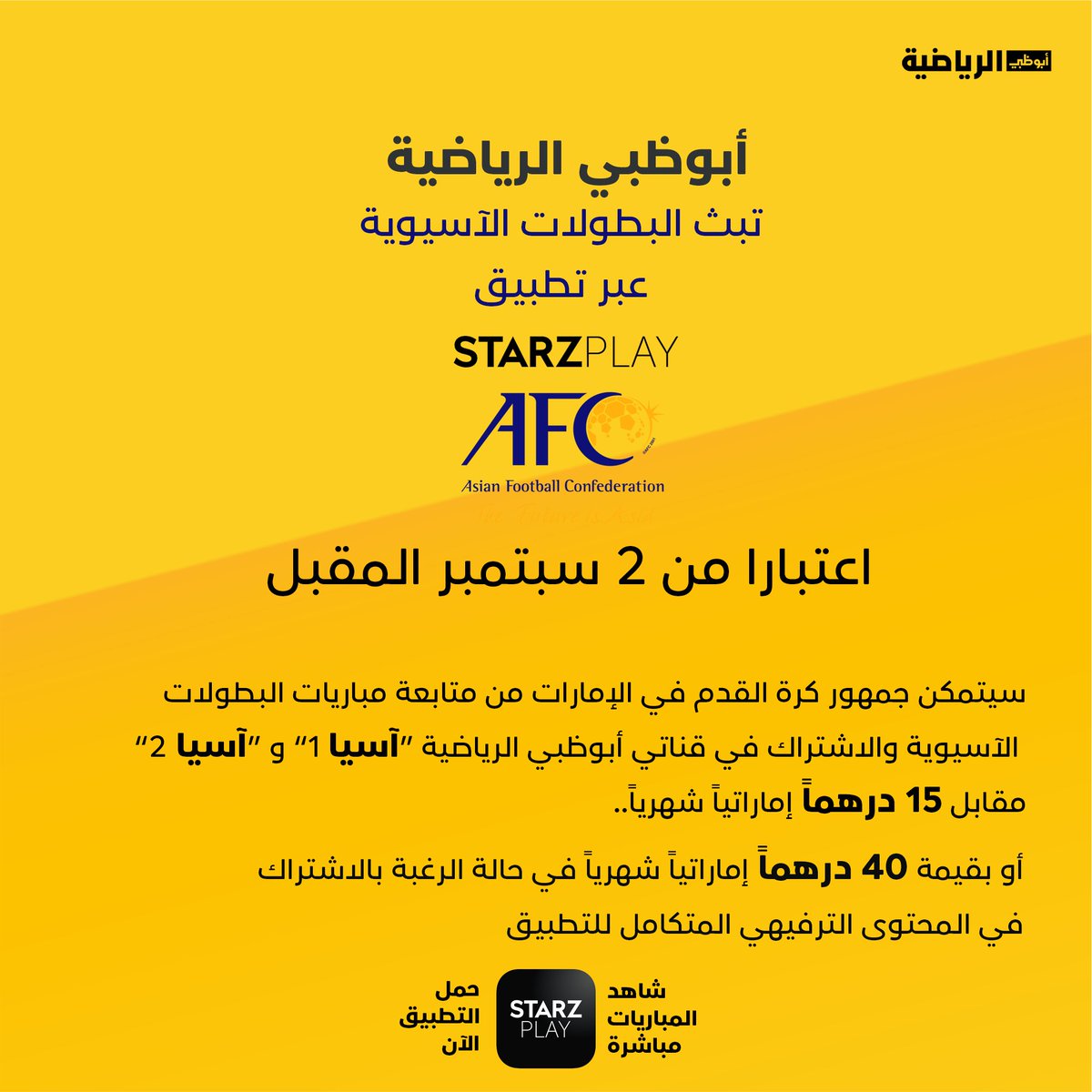 قناة أبوظبي الرياضية Auf Twitter وسيتمكن جمهور كرة القدم في الإمارات من متابعة مباريات البطولات الآسيوية والاشتراك في قناتي أبوظبي الرياضية آسيا ١ و آسيا٢ مقابل 15 درهما إماراتيا شهري ا أو بقيمة 40